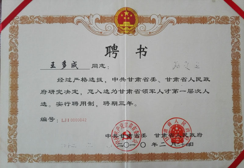 | 2010年榮獲入選為甘肅省領(lǐng)軍人才第一層次人員證書(shū) | ||