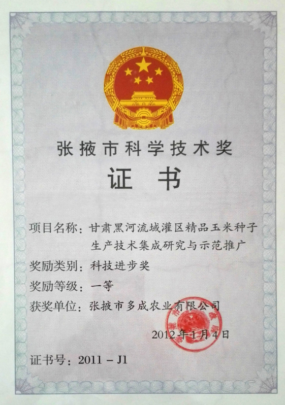 黑河流域精品玉米種子生產技術集成研究推廣科技進步一等獎